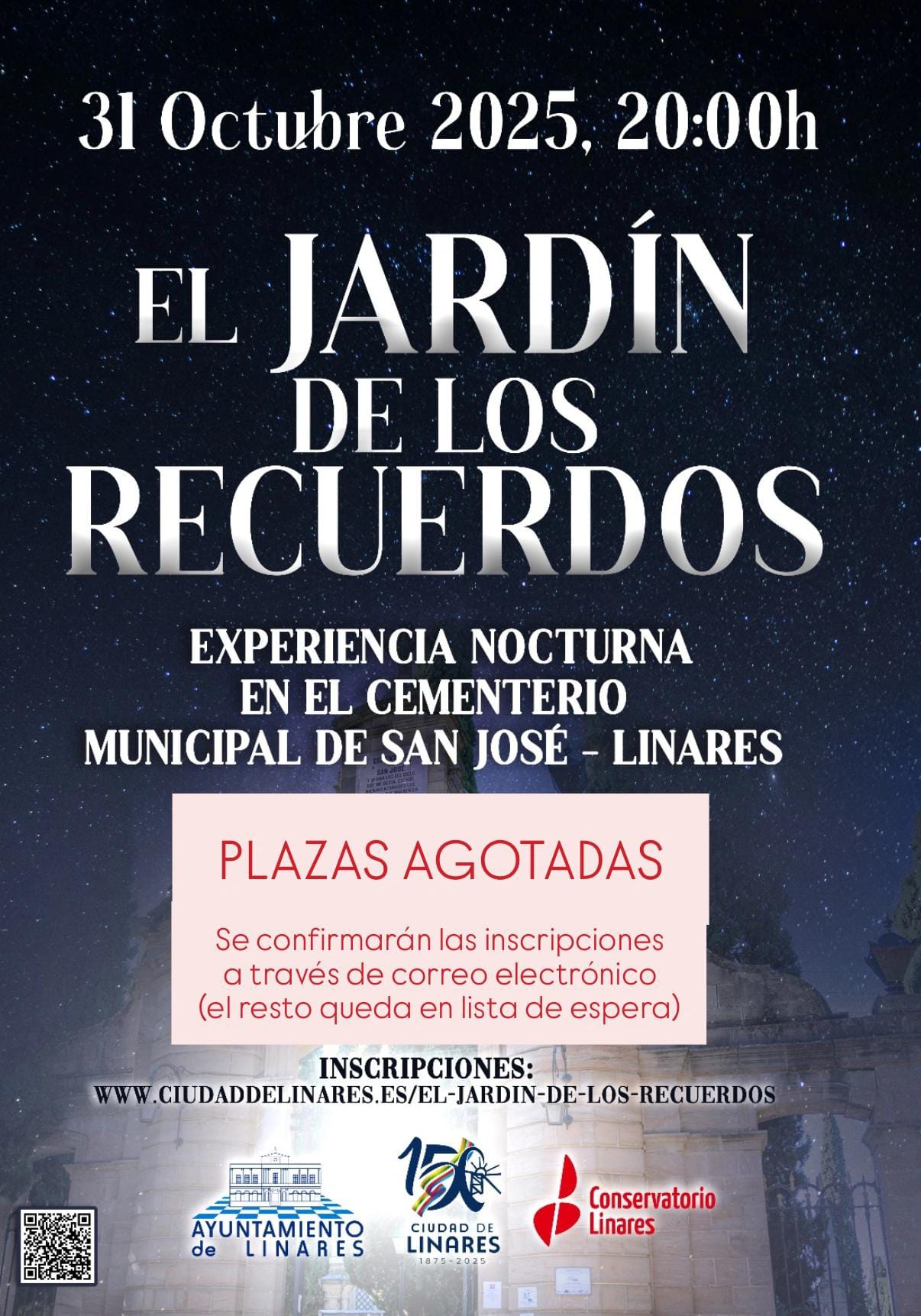 La actividad “El Jardín de los Recuerdos”, organizada por el Área de Salud y Consumo del Ayuntamiento de Linares, ha registrado un éxito sin precedentes, con todas las plazas agotadas en tiempo récord. Ante la enorme demanda, se ha decidido duplicar el aforo y ofrecer dos pases el próximo 31 de octubre, a las 20:00 y 21:15 horas.
